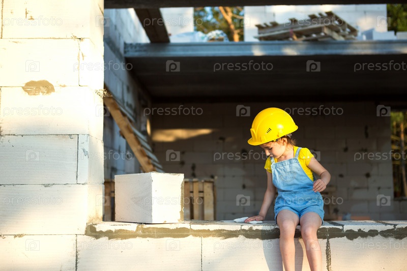 Маленькая девочка в желтой каске играет в строителя на стройке своего будущего дома. Ожидание переезда, выбора профессии, детского образования. Будущая профессия, семейный бизнес