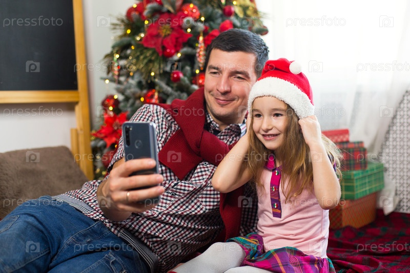 Папа и дочка возле елки со смартфоном делают селфи, общаются по видеосвязи. Рождественские поздравления, подарочная коробка, девушка в шляпе Санты машет привет. Новый год, праздничный декор