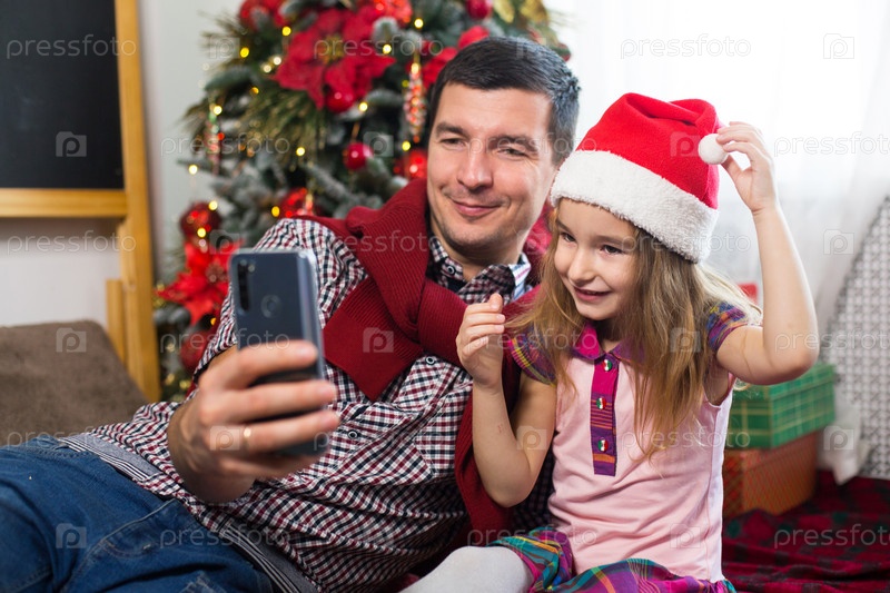 Папа и дочка возле елки со смартфоном делают селфи, общаются по видеосвязи. Рождественские поздравления, подарочная коробка, девушка в шляпе Санты машет привет. Новый год, праздничный декор