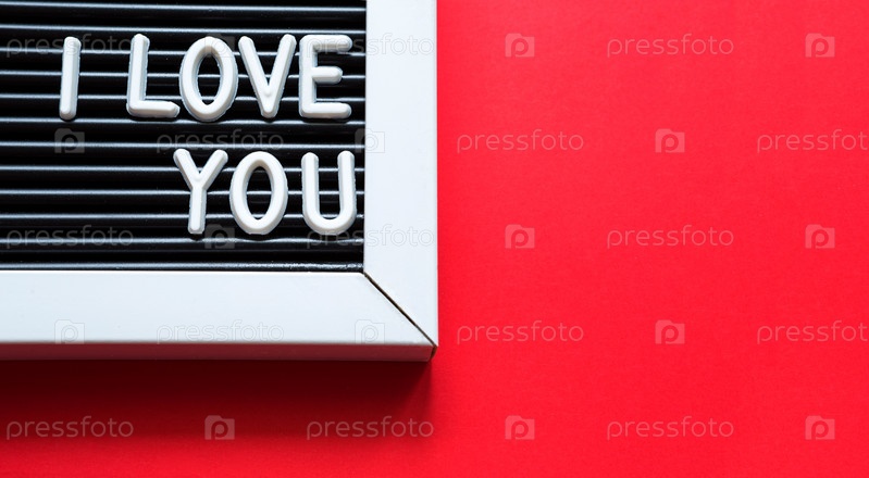 Я люблю тебя белыми буквами на доске в рамке. Доска для записей и тегов. День святого Валентина, признание в любви, письмо, открытка. Скопируйте пространство, красный фон