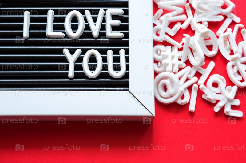 Я люблю тебя белыми буквами на доске в рамке. Доска для записей и тегов. День святого Валентина, признание в любви, письмо, открытка. Скопируйте пространство, красный фон