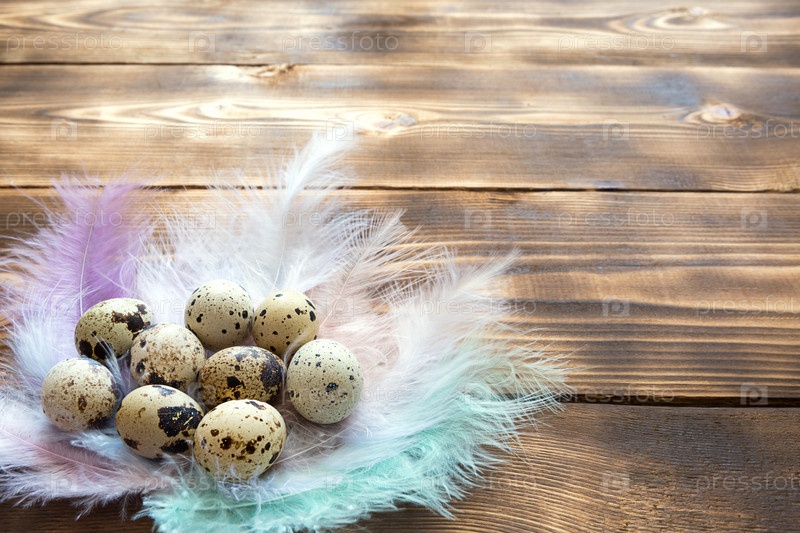 Пятнистые перепелиные яйца на деревянном столе в гнезде из нежных перьев пастельных тонов. Фон пасхальной деревни, натуральные экологически чистые продукты. Копировать пространство