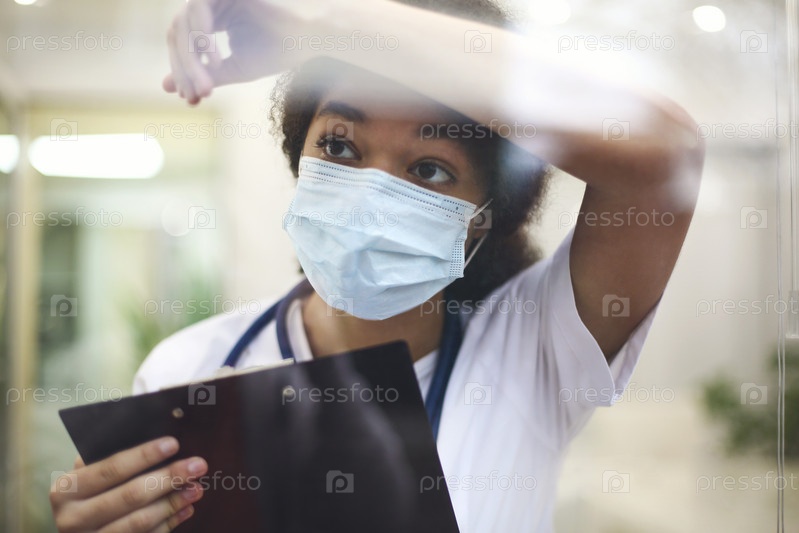 Молодой уставший переутомленный афроамериканский медицинский работник в защитной маске смотрит в окно