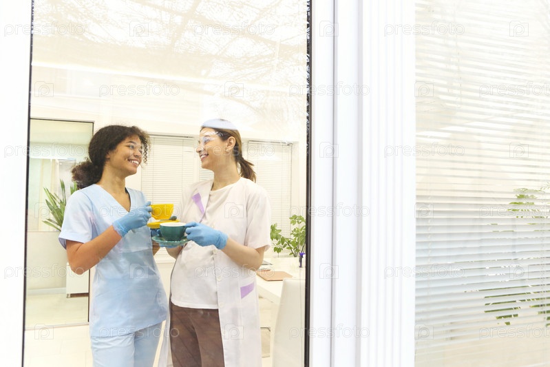 Две счастливые многоэтнические коллеги-медики пьют кофе или чай и разговаривают