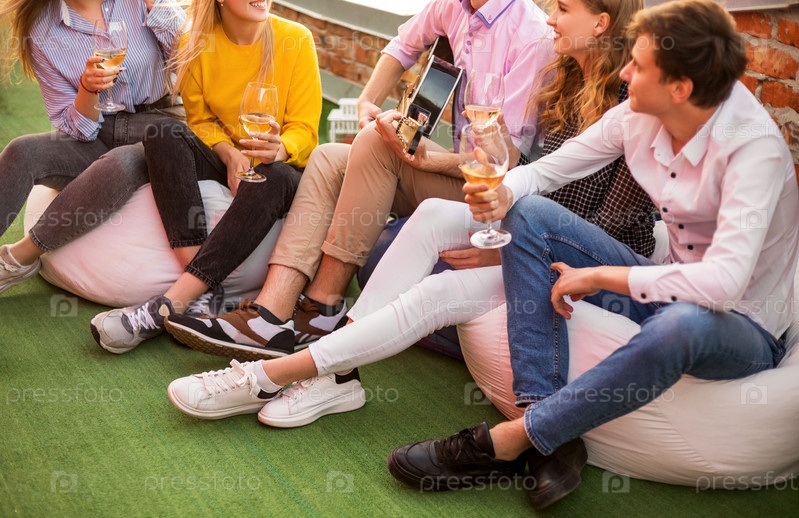 Веселые друзья пьют белое вино во время вечеринки
