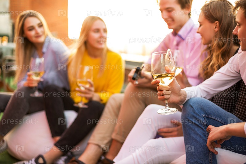 Веселые друзья пьют вино во время вечеринки