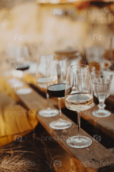 Деревянный стол со стеклянной посудой для пикника