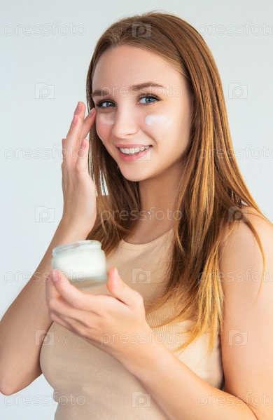 Молодая женщина размазывает крем по лицу