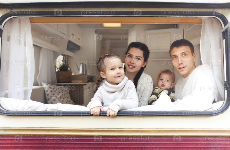 Портрет улыбающейся счастливой семьи с детьми в доме на колесах