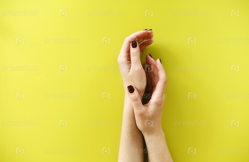 Женщина с маникюром кладет руки на желтый фон