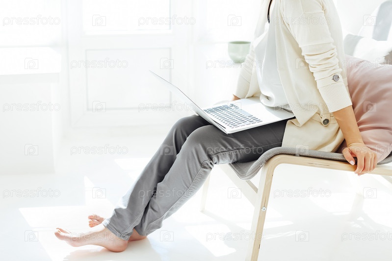 Молодая женщина отдыхает с ноутбуком. Крупным планом
