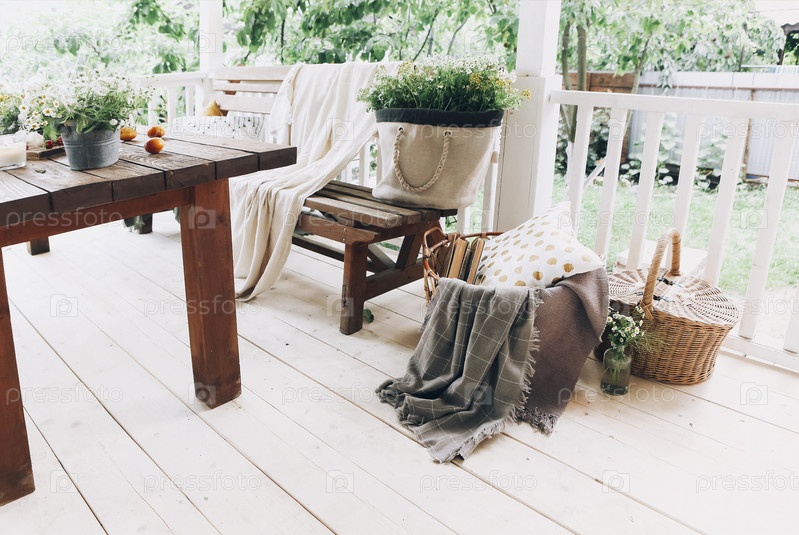 Уютная веранда со скамейкой и цветами