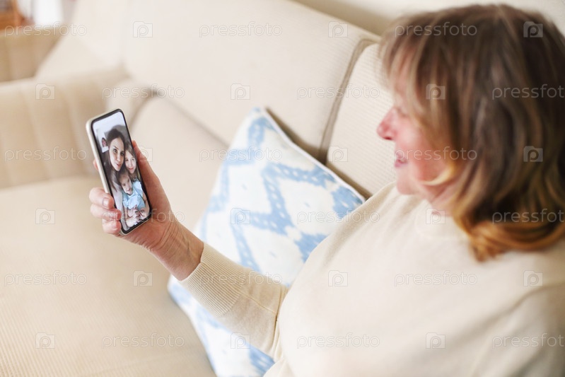 Женщина разговаривает с родственниками во время видеозвонка на смартфоне