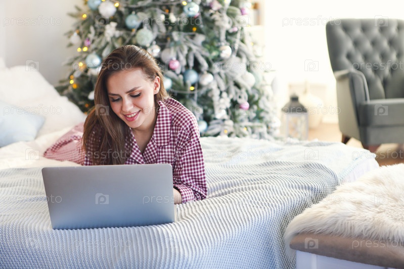 Расслабленная женщина с горячим напитком смотрит фильм на ноутбуке во время рождественских каникул