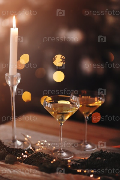 Бокалы игристого вина на деревянном столе на Рождество