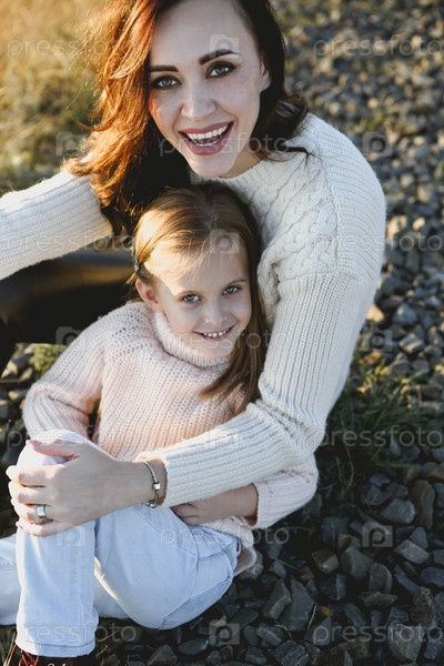 Молодая мать и ее маленькая дочь на улице в солнечный осенний день