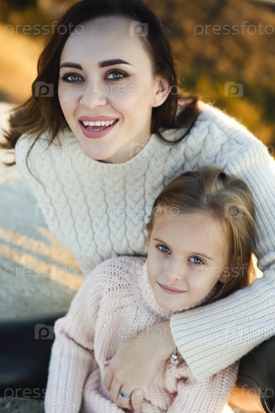Молодая мать и ее маленькая дочь на улице в солнечный осенний день