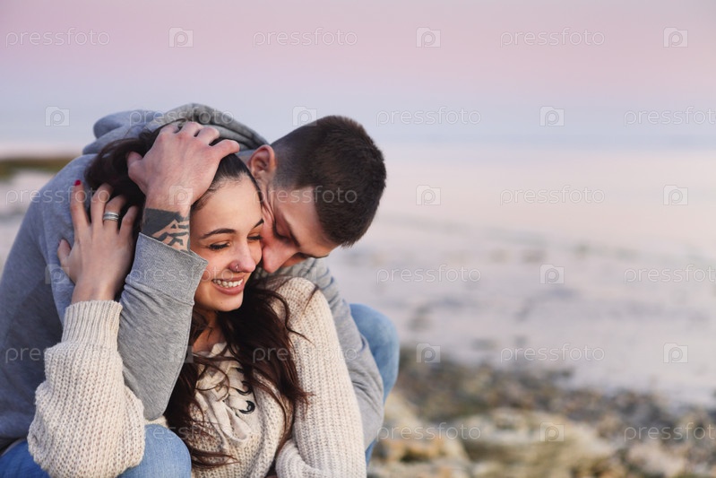 Молодая пара на скалистом побережье на закате