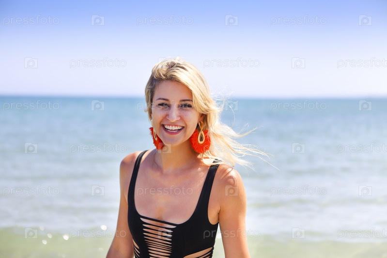 Женщина в черных купальниках на летнем пляже