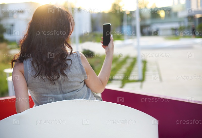 Женщина фотографирует закат в городе