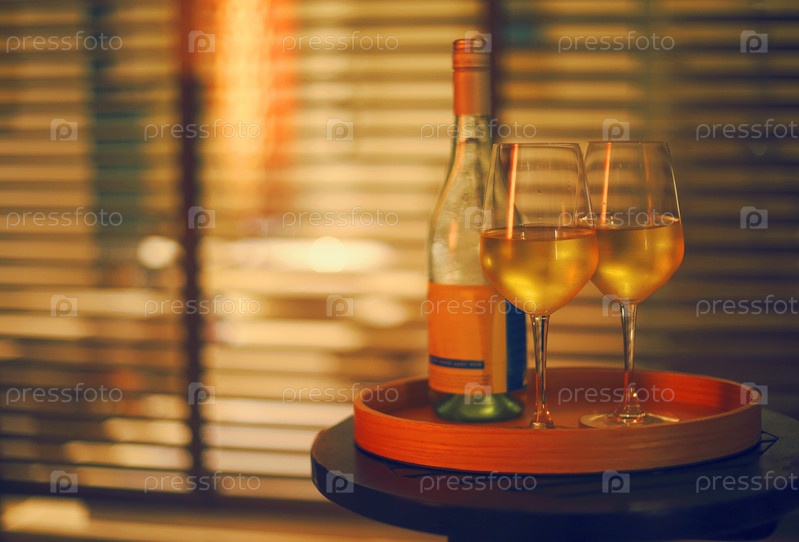 Два бокала белого вина и бутылка в ресторане на размытом фоне