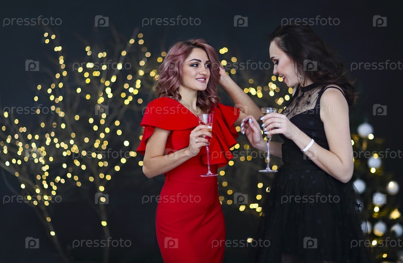 Улыбающиеся женщины в вечерних платьях с бокалами шампанского на фоне огней