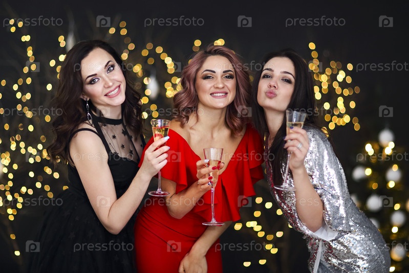 Улыбающиеся женщины в вечерних платьях с бокалами шампанского на фоне огней