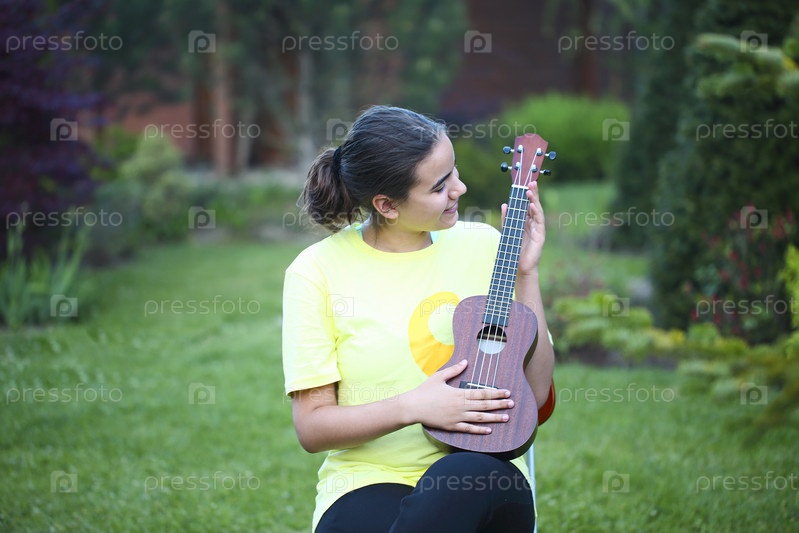 Симпатичная девочка-подросток обнимает свою укулеле на улице вечером