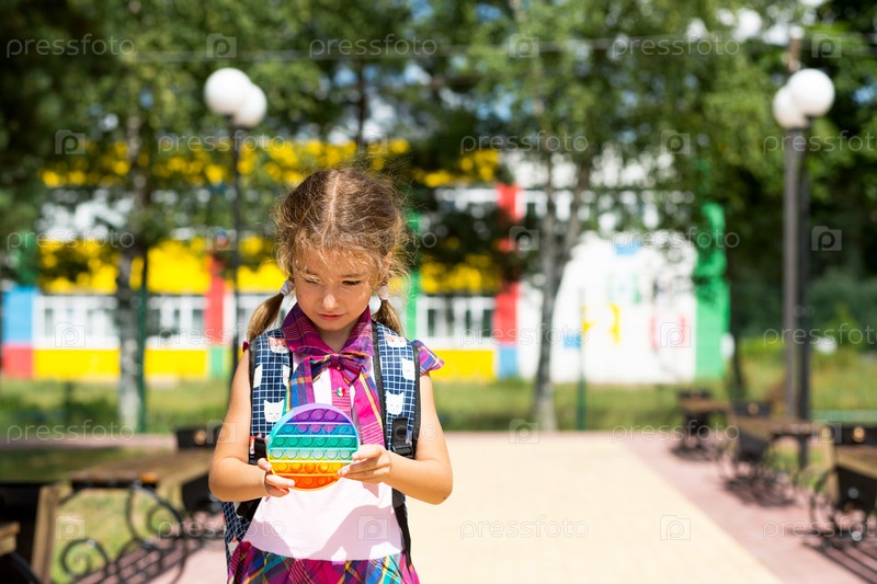 Маленькая девочка с рюкзаком и в школьной форме во дворе школы играет в поп-игрушку. Снова в школу, 1 сентября. Ученик отдыхает после уроков. Начальное образование, начальный класс для ученика