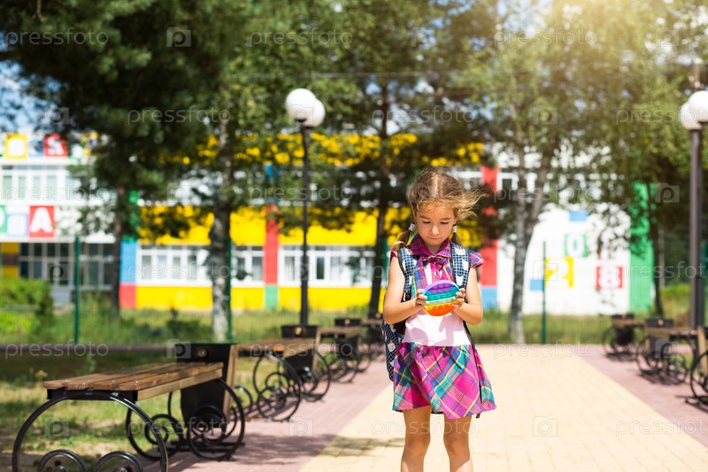 Маленькая девочка с рюкзаком и в школьной форме во дворе школы играет в поп-игрушку. Снова в школу, 1 сентября. Ученик отдыхает после уроков. Начальное образование, начальный класс для ученика