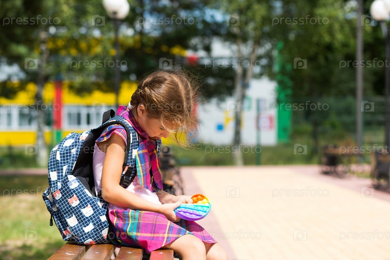 Маленькая девочка с рюкзаком и в школьной форме во дворе школы играет в поп-игрушку. Снова в школу, 1 сентября. Ученик отдыхает после уроков. Начальное образование, начальный класс для ученика