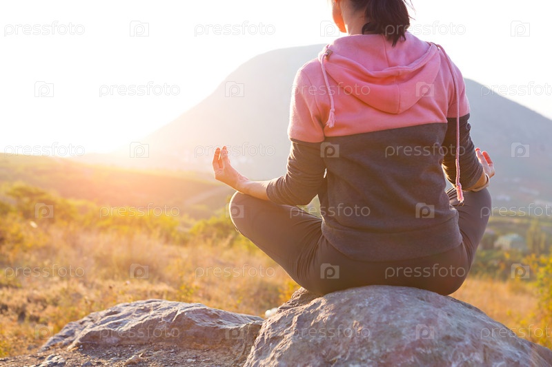 Женщина сидит на камне в позе лотоса, сомкнув пальцы в знак гармонии, расслабления и медитации. Йога, погружение в себя, баланс с природой. Горы, солнечный свет. копировать пространство