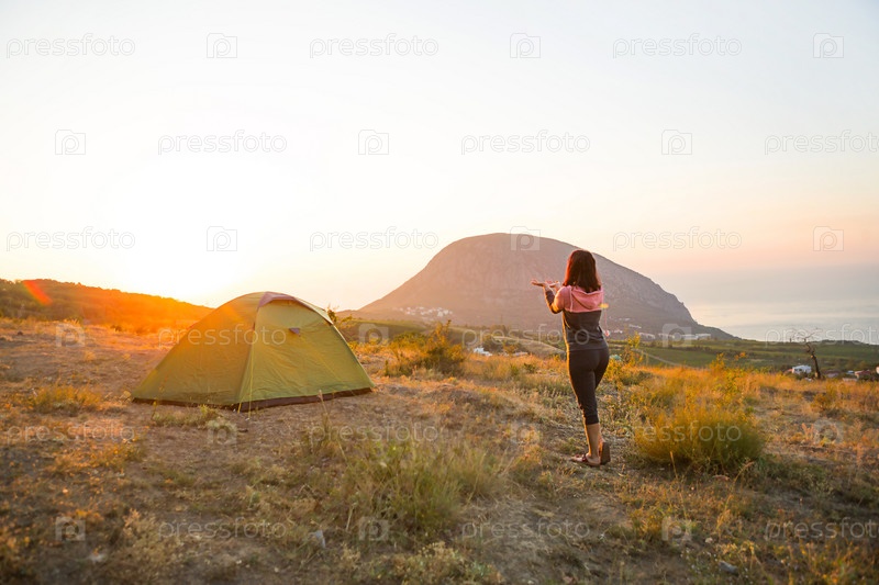 Женщина встречает рассвет в горах, радуется солнцу. Панорамный вид на горы и море сверху. Кемпинг, активный отдых, спортивный горный туризм, семейный отдых. Аю-Даг, Крым