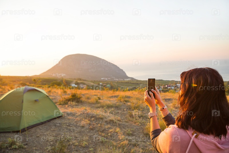Женщина фотографирует восход солнца в горах на свой телефон. Селфи на восходящем солнце. Панорамный вид на море и Аю-Даг. Кемпинг, активный отдых, спортивный горный туризм, семейный отдых. Крым
