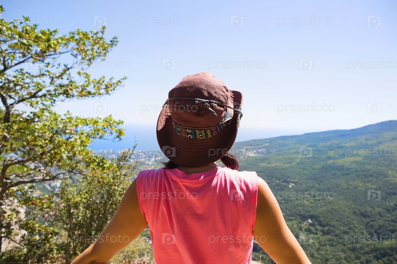 Женщина в шляпе смотрит на панорамный вид с горы на море и лес. Турист, походы, путешествия. Активный экотуризм, здоровый образ жизни, приключения