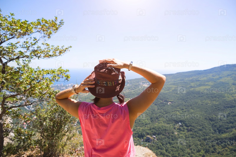 Женщина в шляпе смотрит на панорамный вид с горы на море и лес. Турист, походы, путешествия. Активный экотуризм, здоровый образ жизни, приключения