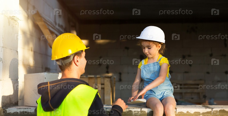Папа и дочь на стройке своего будущего дома. Выбор будущей профессии строителя передается ребенку по наследству. Ожидание переезда, мечта о доме. Ипотечный заем