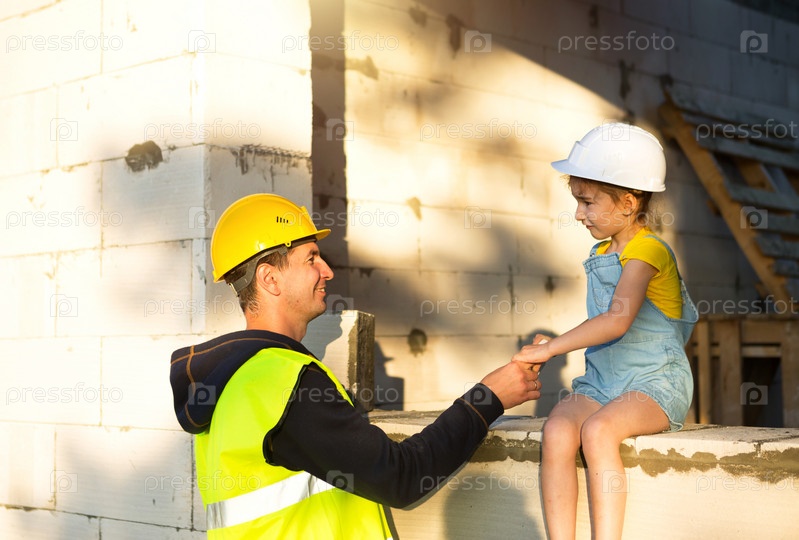Папа и дочь на стройке своего будущего дома. Выбор будущей профессии строителя передается ребенку по наследству. Ожидание переезда, мечта о доме. Ипотечный заем
