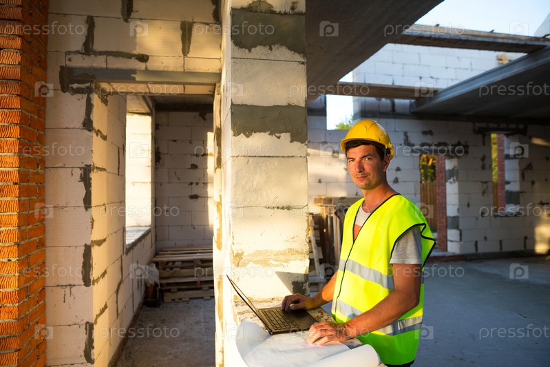 Инженер-строитель на строительной площадке дома из пористых бетонных блоков работает за компьютером в светоотражающем жилете и каске. Дизайн, строительство, чертежи проекта, проверка