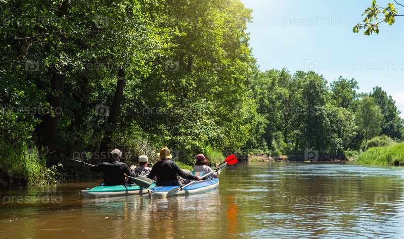 Семейный поход на байдарках. Мужчина и женщина и пожилые пары старший и старший гребная лодка на реке, поход на воду, летнее приключение. Экологичный и экстремальный туризм, активный и здоровый образ жизни