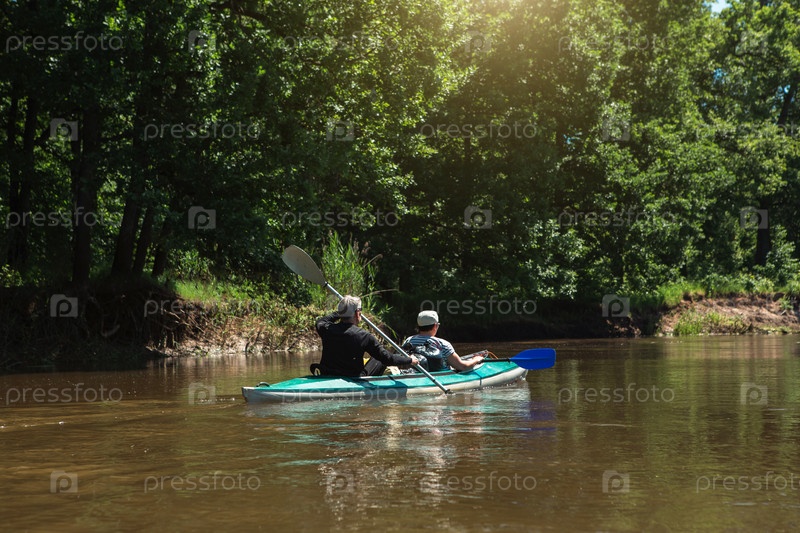 Семейный поход на байдарках. Пожилая супружеская пара гребет на лодке по реке, водная прогулка, летнее приключение. Возрастной спорт, психическая молодость и здоровье, туризм, активная старость