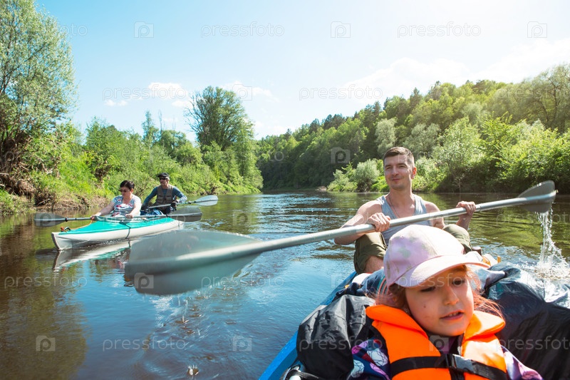 Семейный поход на байдарках. Отец и дочь, пожилая пара старший и старший на гребной лодке по реке, водный поход, летнее приключение. Экологичный и экстремальный туризм, активный и здоровый образ жизни