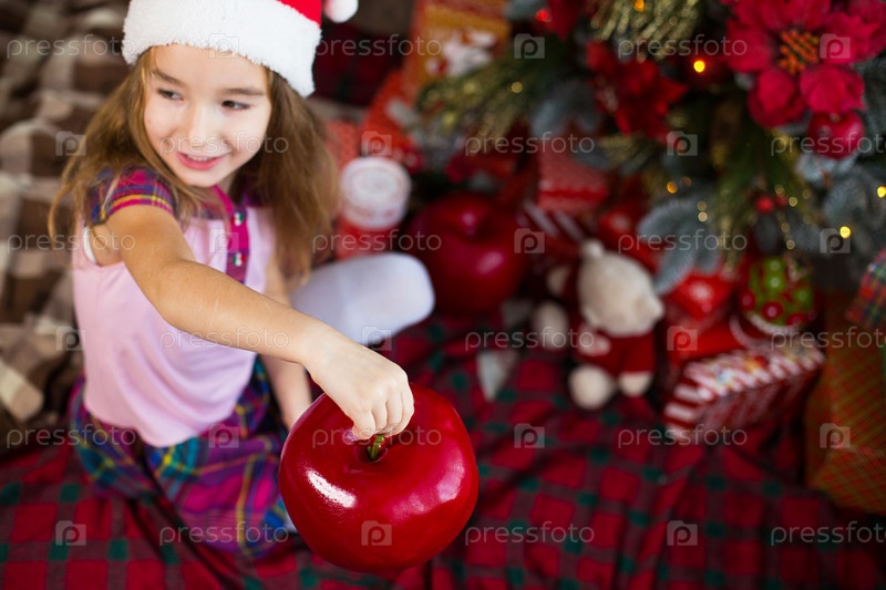 Маленькая девочка в шапке Санты играет на пледе возле елки с большим красным декоративным яблоком. Рождество, новый год, праздничная атмосфера. Место для текста. Выборочный фокус