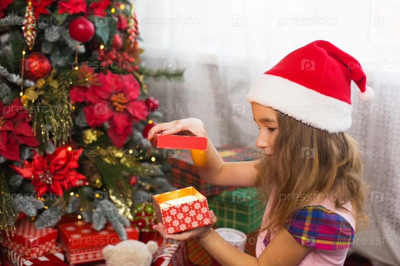 Маленькая девочка в шапке Санты открывает красную коробку с подарком и золотым волшебным светом возле елки. Праздничный декор, пуансеттия на елках, Новый год. Радость, удивление, детские эмоции. Копипространство
