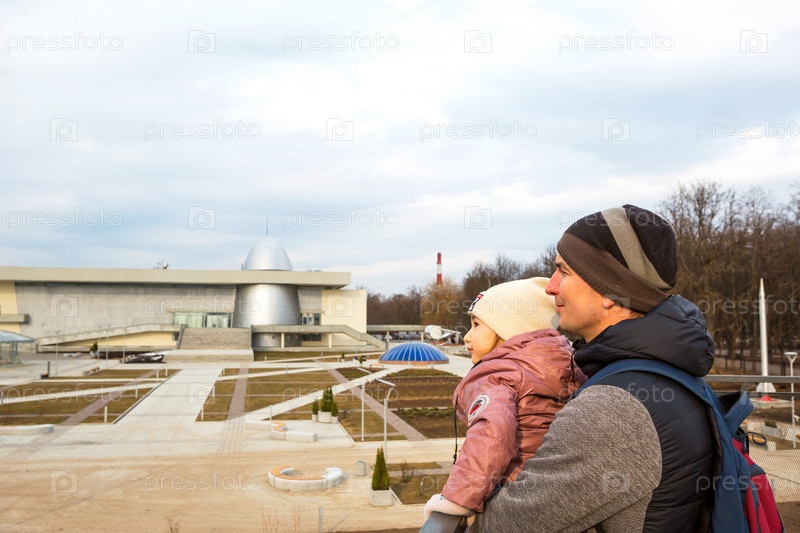 Калужский музей космонавтики - подготовка к открытию 2-й очереди. Отец и дочь на смотровой площадке перед музеем и ракетой Восток. 7 апреля 2021 г., Калуга, Россия