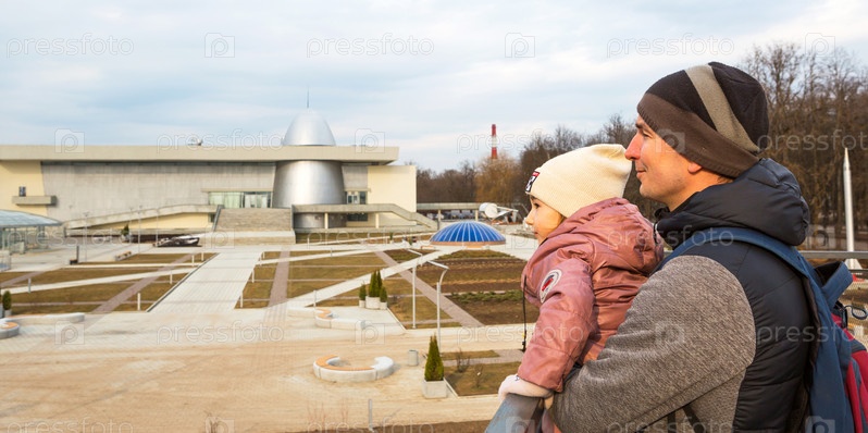 Калужский музей космонавтики - подготовка к открытию 2-й очереди. Отец и дочь на смотровой площадке перед музеем и ракетой Восток. 7 апреля 2021 г., Калуга, Россия