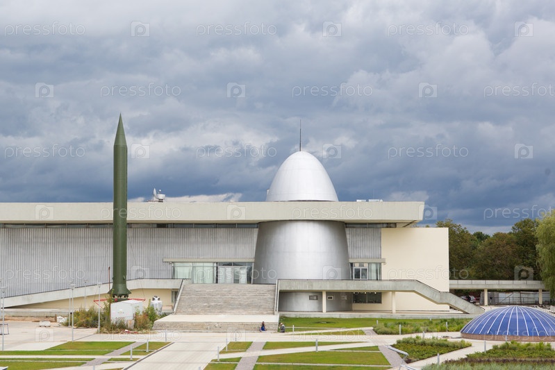 Россия, Калуга, 14 августа 2020 г. Калужский музей космонавтики. Ракета, купол планетария, парк перед зданием, реконструкция, строительство второй очереди