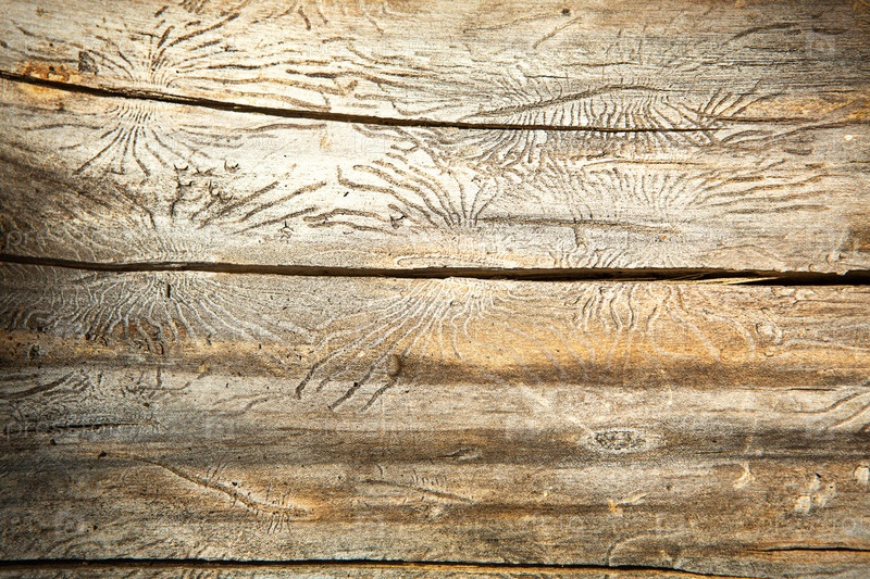 Текстура натурального дерева с линиями, нарисованными короедом в форме пауков. Фон, жук-короед, ствол дерева