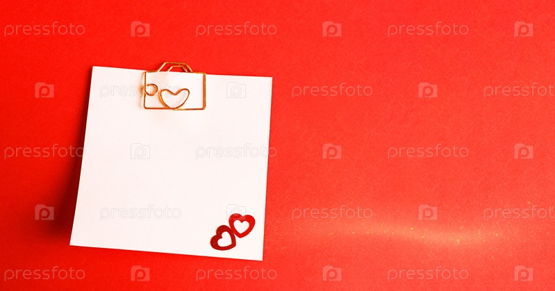 Квадратный лист для заметок со скрепкой в форме буквы и сердца. Декор влюбленных пар с сердечками на красном фоне. День святого Валентина, сообщение, приветствие, признание в любви. Копировать пространство
