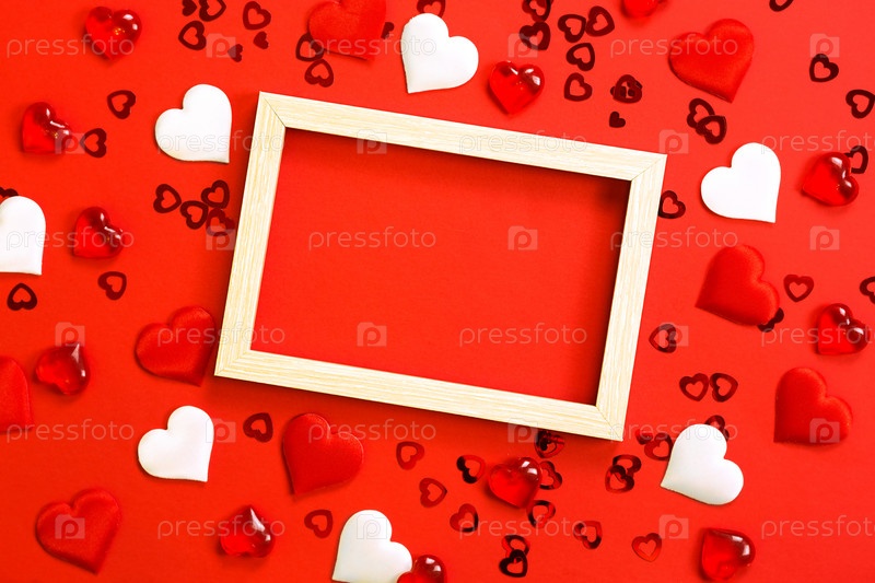 Текст или фоторамка в центре, окруженная сердечками. Декор влюбленных пар с сердечками на красном фоне. День святого Валентина, сообщение, приветствие, признание в любви. Копировать пространство